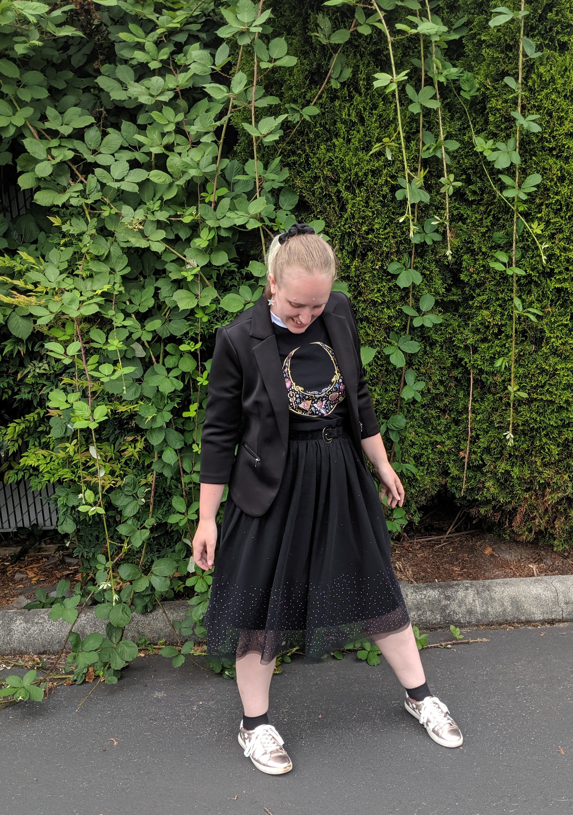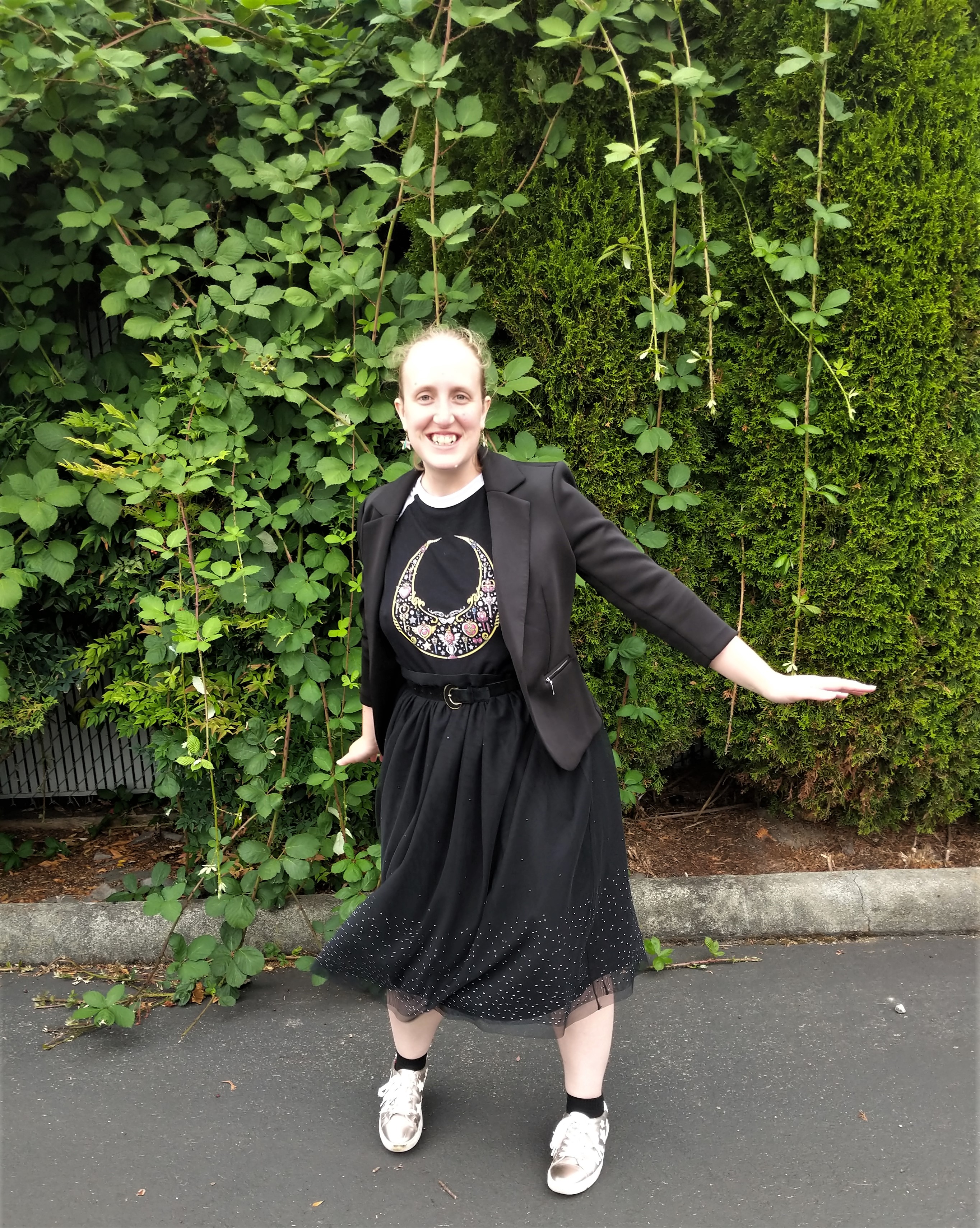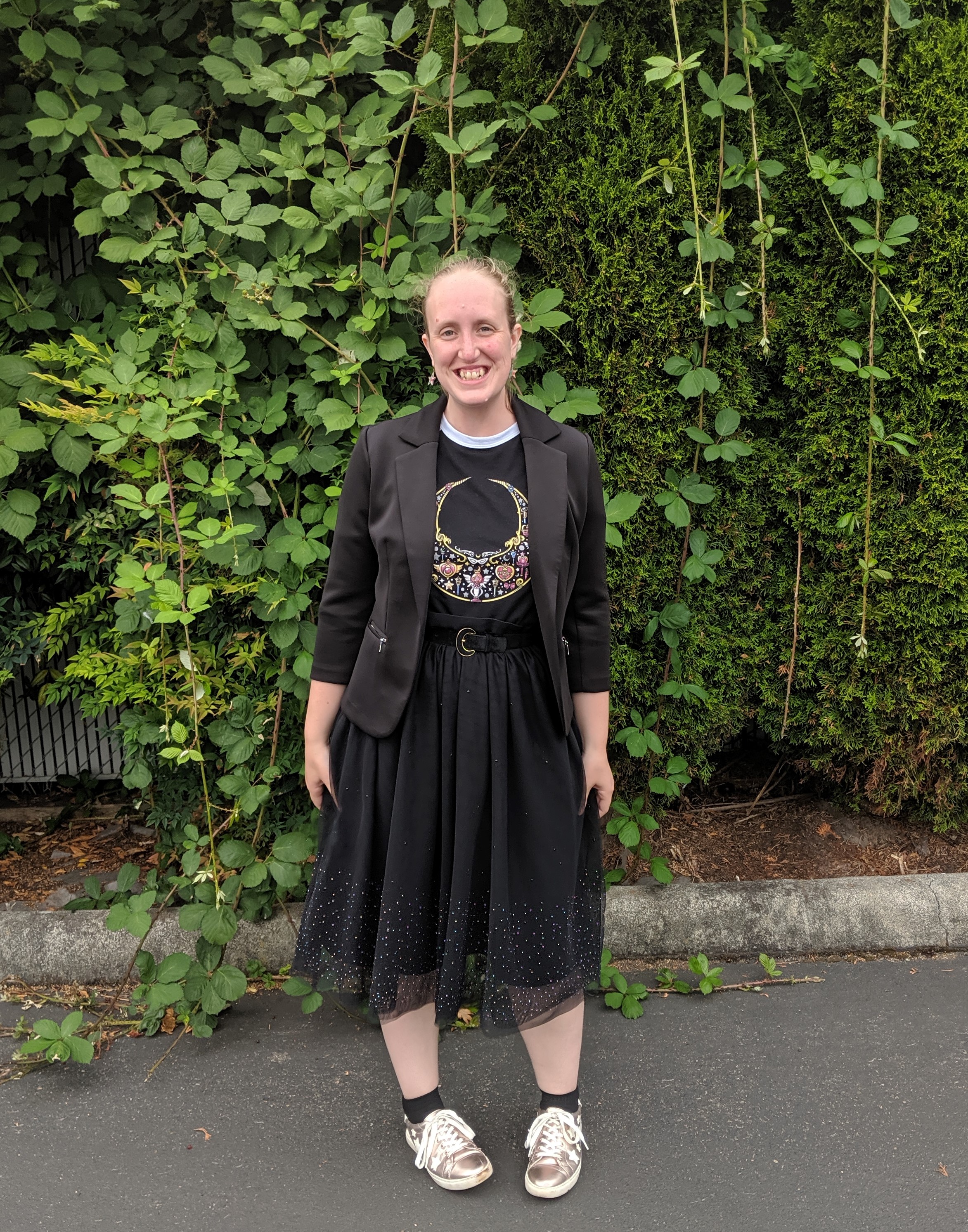 Honestly, I really liked this outfit, which made every comment feel like a compliment. I started with the Sailor Moon baseball t-shirt, and built the outfit up from there. The skirt for a little starry sky sparkle, the belt with its moon theme, the shiny star sneakers, and then my blazer to give it a final touch. I enjoyed the monochrome feel of this outfit – it’s a lot of black, but in a good way. And there are still lots of interesting parts to break it up.